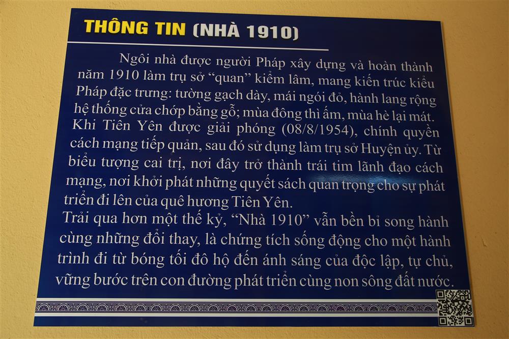 Theo tư liệu trong cuốn "Lịch sử Đảng bộ huyện Tiên Yên giai đoạn 1915 – 2015", năm 1886, thực dân Pháp chiếm đóng toàn bộ miền Đông Bắc, mà địa bàn cửa ngõ là Tiên Yên. Nhằm thực hiện âm mưu thôn tính nước ta lâu dài và khống chế toàn bộ khu vực có địa thế chính trị hết sức quan trọng này, nên ngày từ đầu thế kỷ XX, chúng đã dốc sức xây dựng các boong ke, lô cốt, hầm ngầm, cùng các đồn binh, trại lính, trụ sở hành chính như Đồn cao, Khe tù, nhà Dây thép, nhà Kiểm lâm… Các công trình lớn do người pháp xây dựng đều nằm ở thị trấn Tiên Yên và hầu hết còn nguyên vẹn. Công trình kiến trúc pháp đẹp nhất phải kể đến là Trụ sở Huyện ủy Tiên Yên, ngôi nhà được người pháp xây và hoàn thành năm 1910 làm trụ sở “quan” kiểm lâm, mang kiến trúc kiểu pháp đặc trưng: Tường gạch dày, mái ngói đỏ, hành lang rộng, hệ thống cửa chớp bằng gỗ; mùa đông thì ấm, mùa hè lại mát. Khi Tiên Yên được giải phóng (08/8/1954), chính quyền cách mạng tiếp quản, sau đó làm trụ sở Huyện ủy. Từ biểu tượng cai trị, nơi đây trở thành trái tim lãnh đạo cách mạng, nơi khởi phát những quyết sách quan trọng cho sự phát triển đi lên của quê hương Tiên Yên. Trải qua hơn một thế kỷ, “Nhà 1910” vẫn bền bỉ song hành cùng những đổi thay, là chứng tích sống động cho một hành trình đi từ bóng tối đô hộ đến ánh sáng của độc lập, tự chủ, vững bước trên con đường phát triển non sông đất nước.