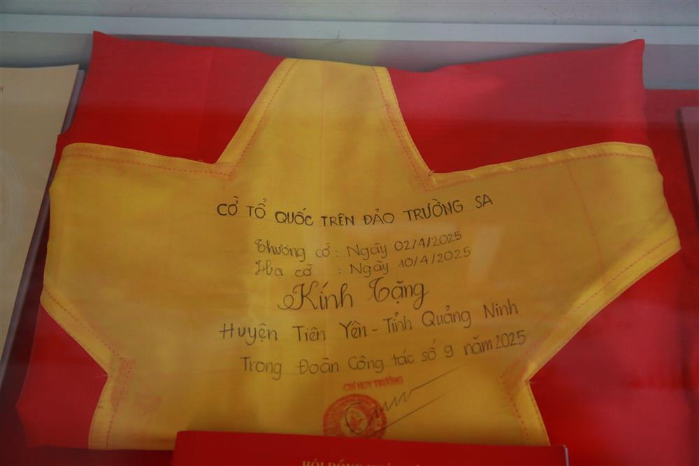 Các chiến sĩ quần đảo Trường xa tặng lá cờ Tổ quốc cho đoàn công tác số 9 huyện Tiên Yên khi tới thăm Trường xa năm 2025 |