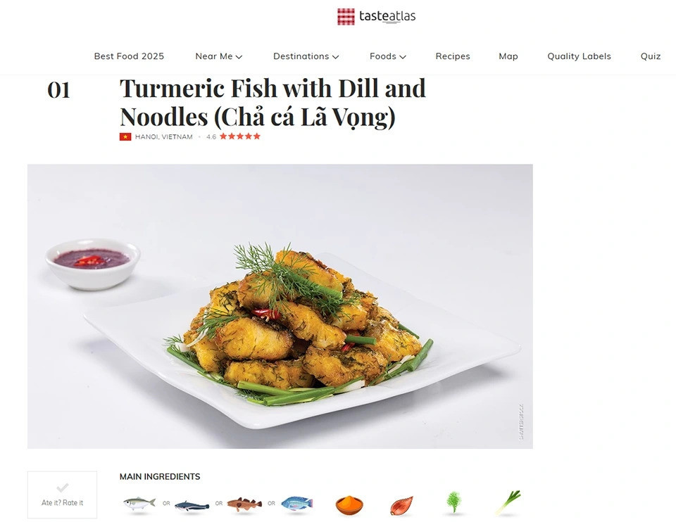 Mới đây, chả cá Lã Vọng của Việt Nam được chuyên trang ẩm thực nổi tiếng thế giới Taste Atlas xếp ở vị trí số 1 trong danh sách những món ăn từ cá trắng ngon nhất thế giới.