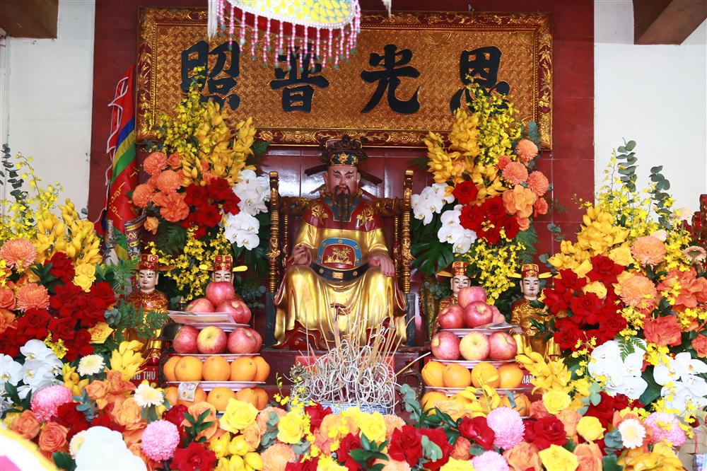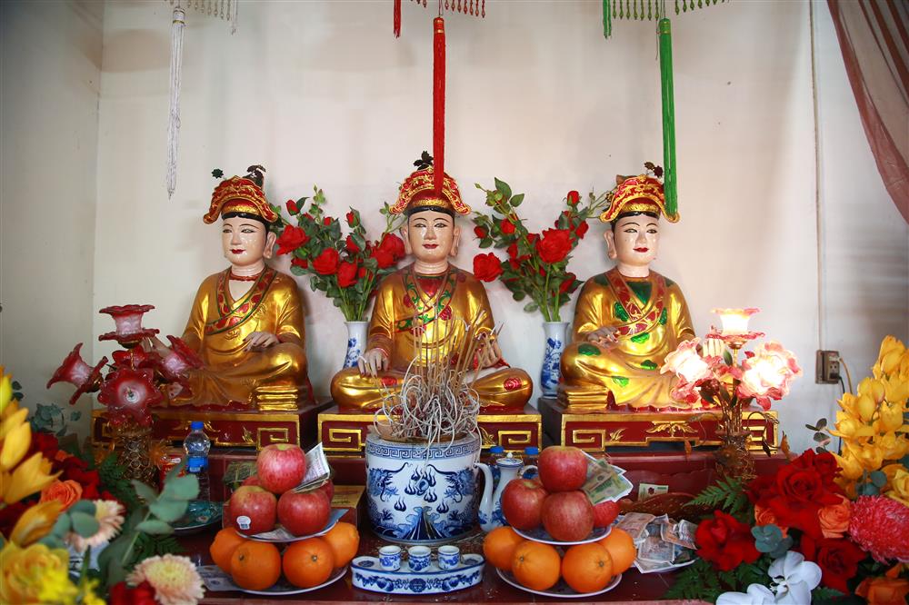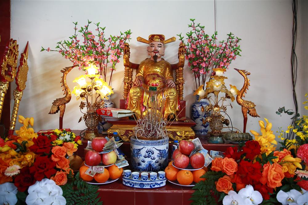 Bàn thờ Đức ông Hoàng Cần đặtc chính giữa trung tâm ngồi trên ngài vàng rồng, đội mũ cánh chuồn |