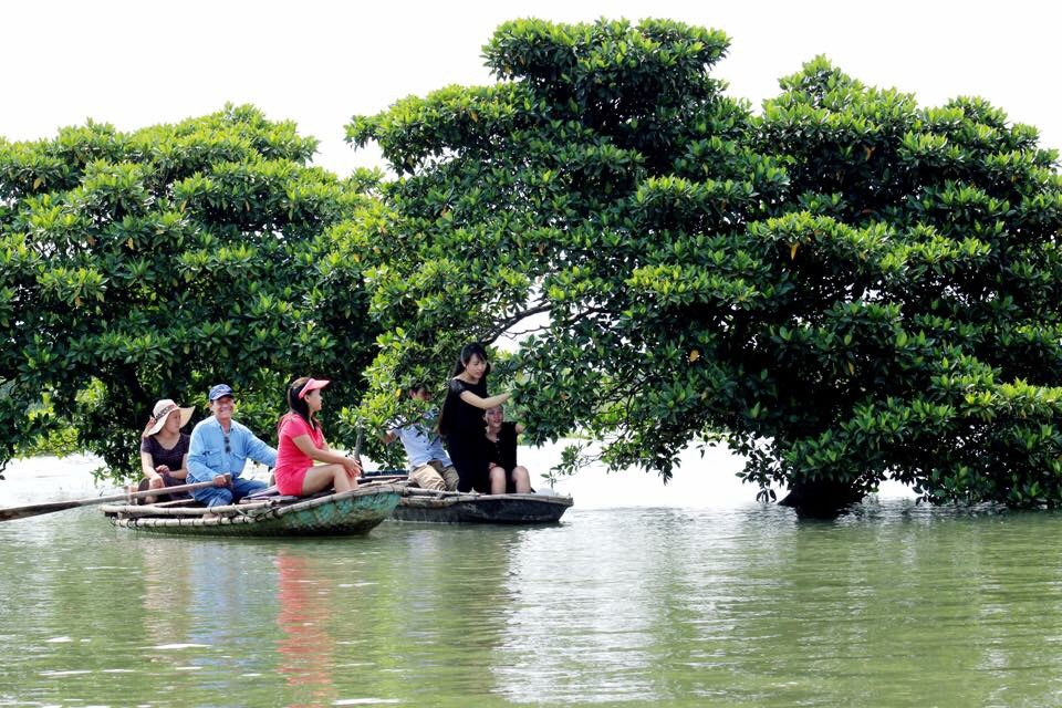 Du khách cùng với ngư dân trên chiếc tàu nhỏ qua sông hai bên xanh ngắt rừng ngập mặn