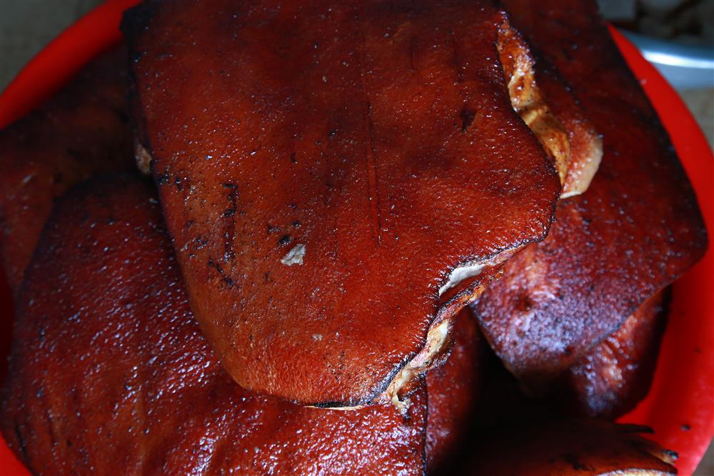 Thỉ ba chỉ sau khi luộc sơ qua sẽ châm đều bì rồi mang đi chiên ngập dầu để bì có màu cánh gián |