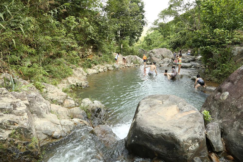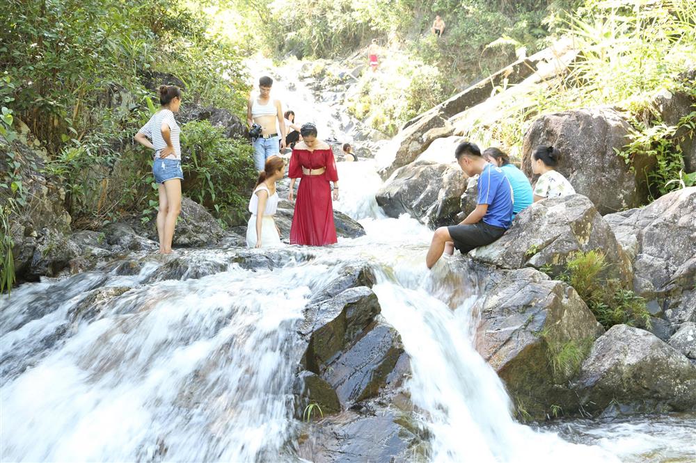 Du khách trải nghiệm tắm trong dòng nước mát lạnh, trắng xóa |