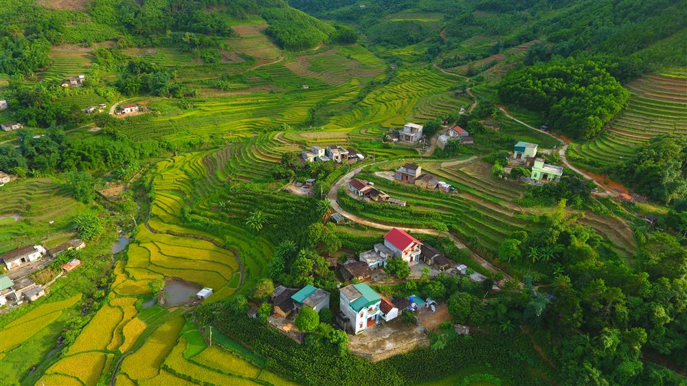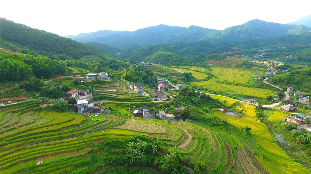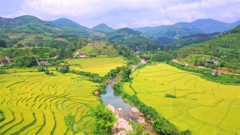 Màu vàng rực rỡ của lúa chín như tấm thảm vàng óng ả, uốn lượn sinh động. |